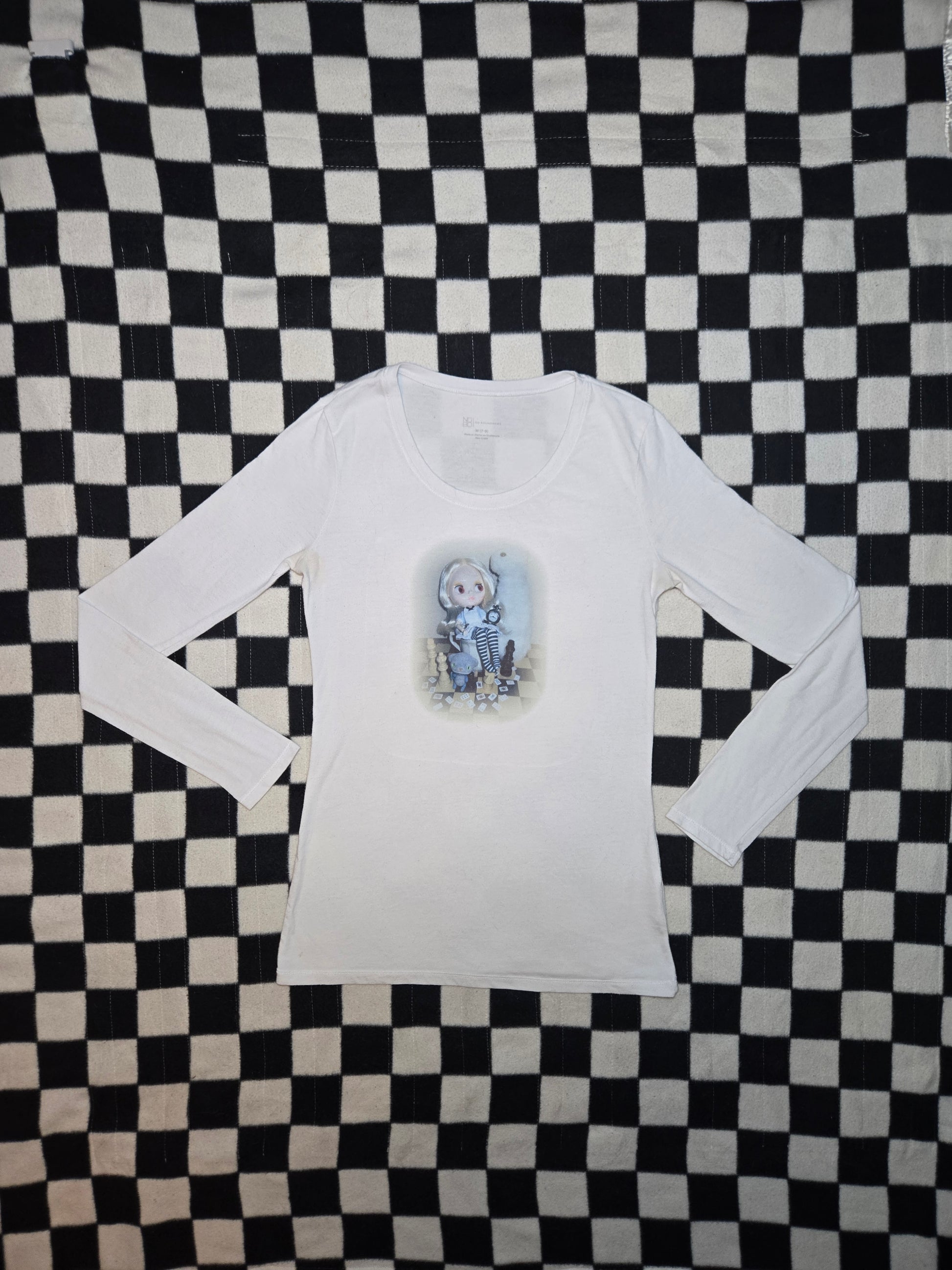 Long sleeved size medium white shirt with print of my own photography of my Alice Blythe doll.