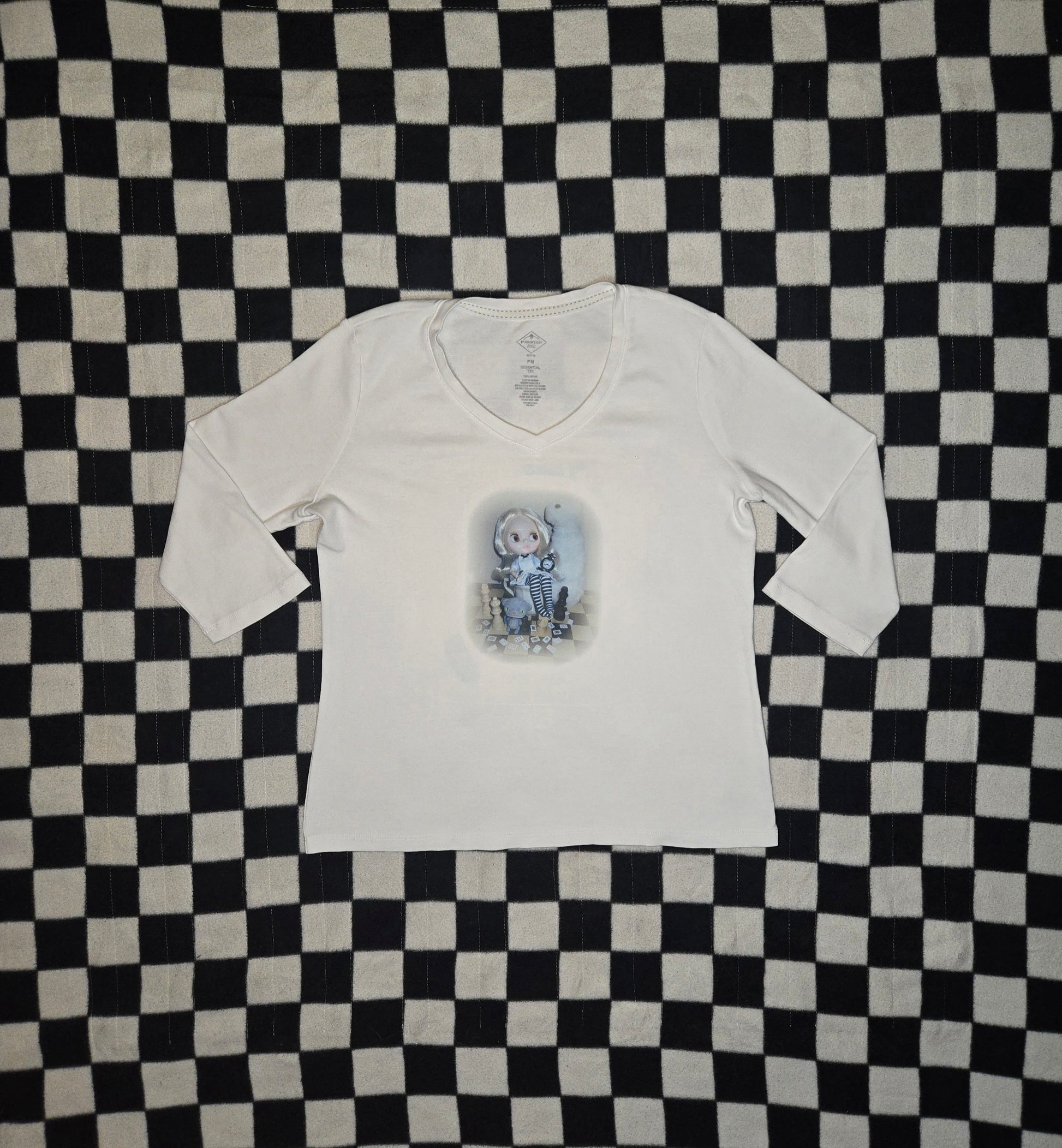 Long sleeved white v-neck shirt with print of my own photography of my Alice in Wonderland Blythe doll (stained)