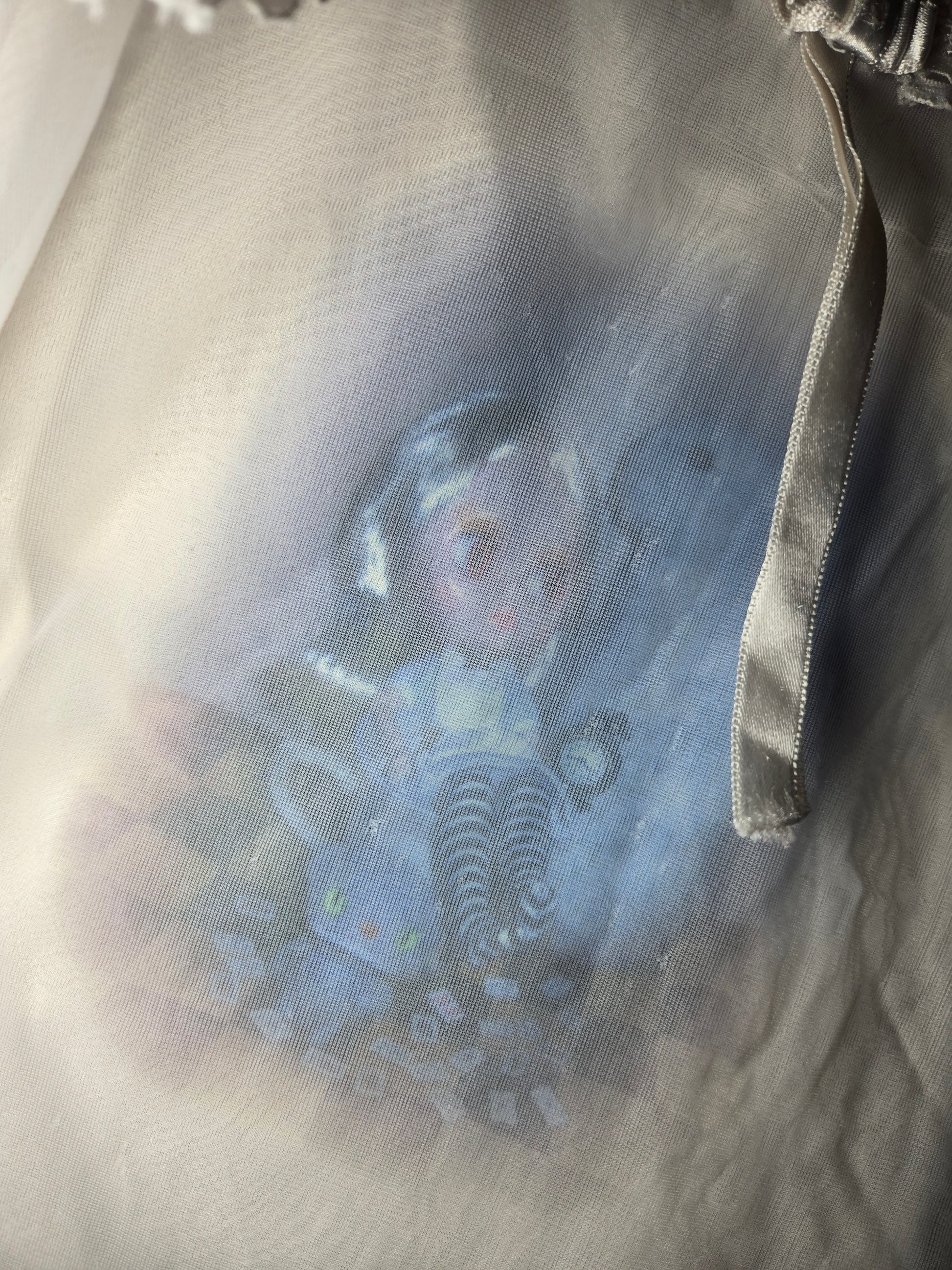 White dress size 38 with lace, a bow, and print of my Alice in Wonderland Blythe doll.