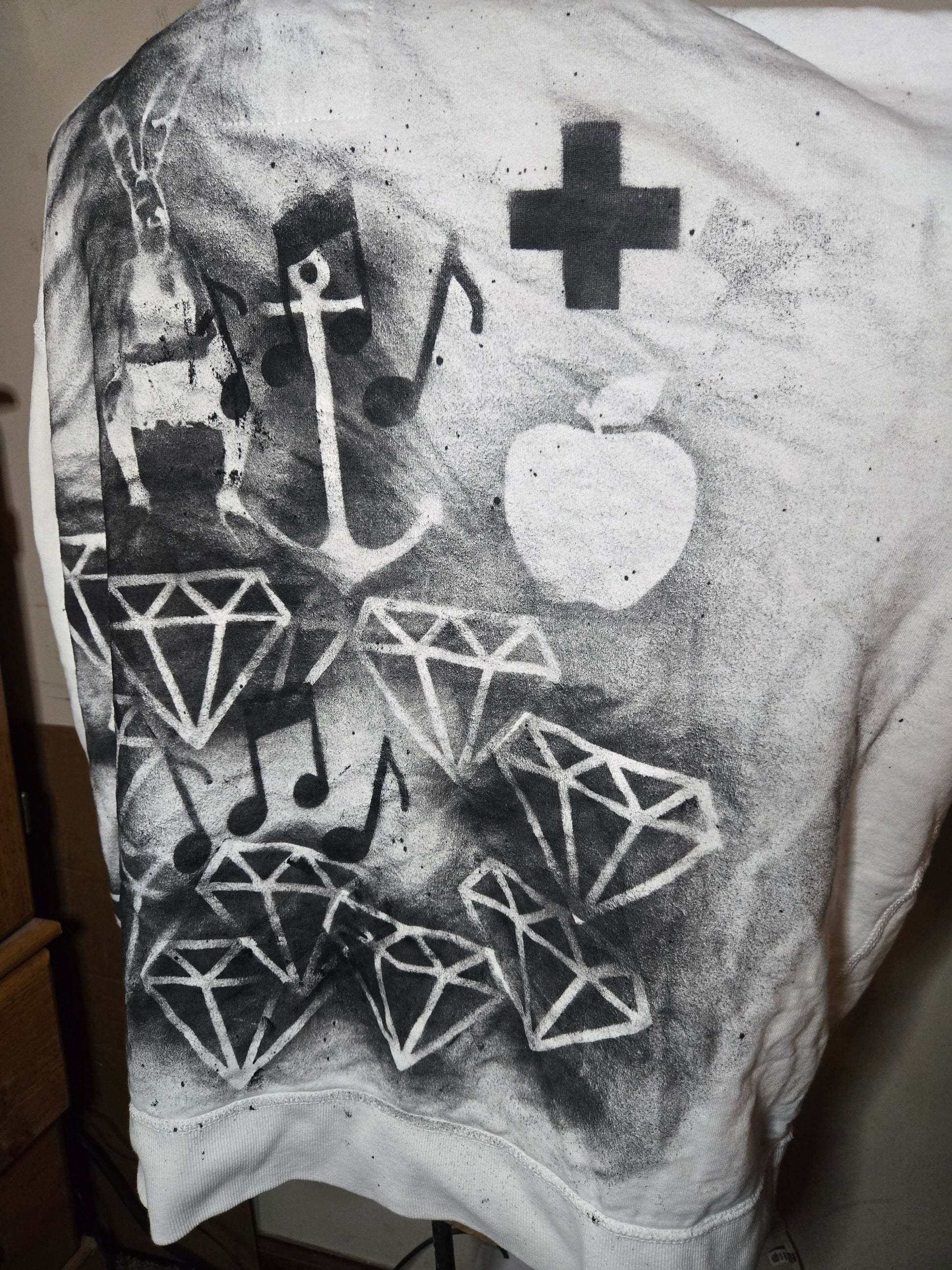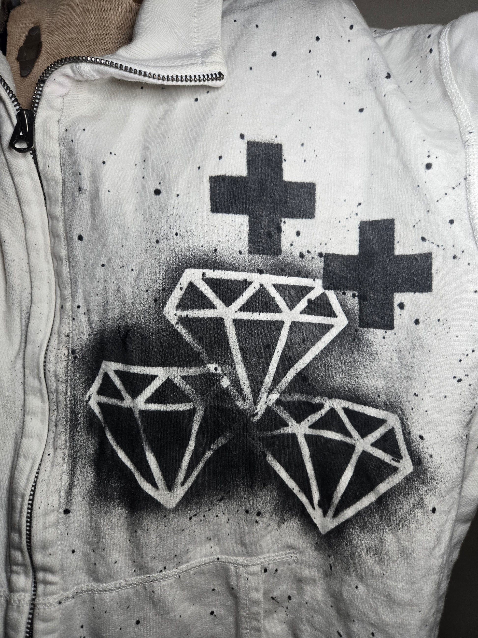 White zip up jacket with spray painted print of the number 12, diamonds, crosses, an anchor, music notes, an apple, and "Bunny boy" from "Gummo"
