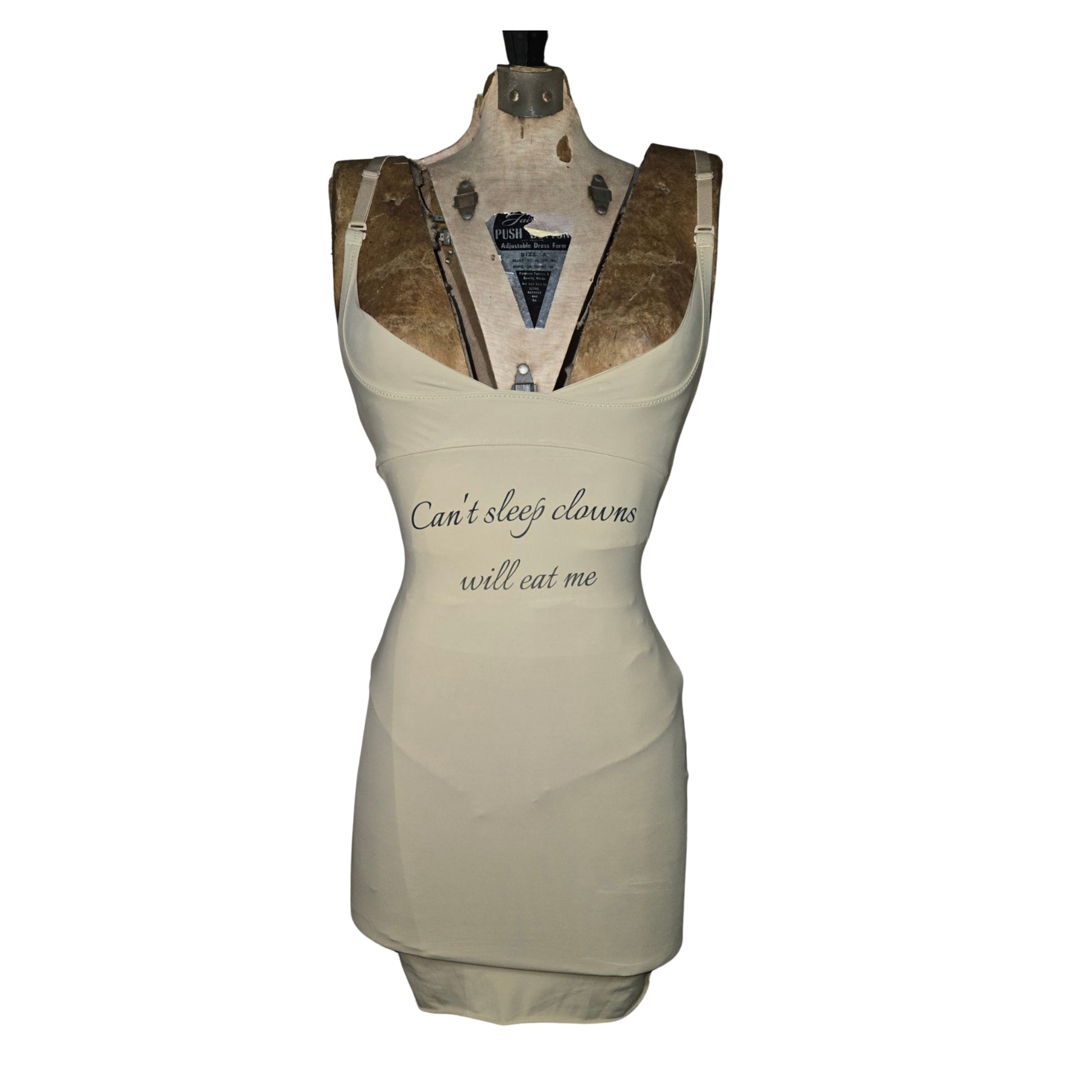 Cream/khaki colored lingerie with print that says "Can't sleep, clowns will eat me."