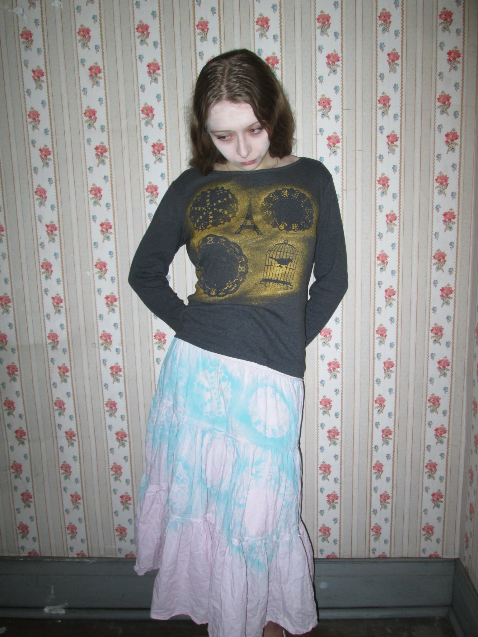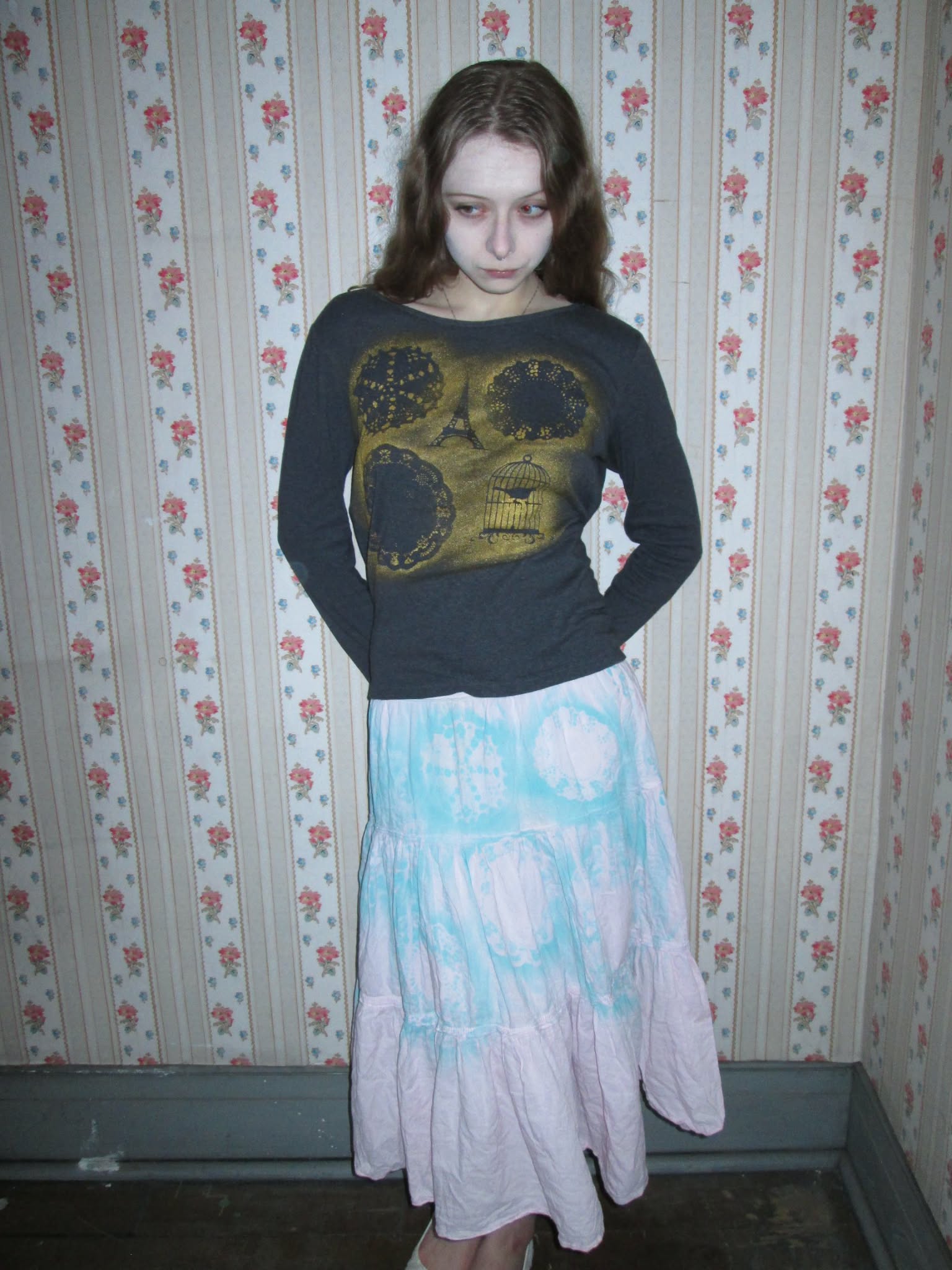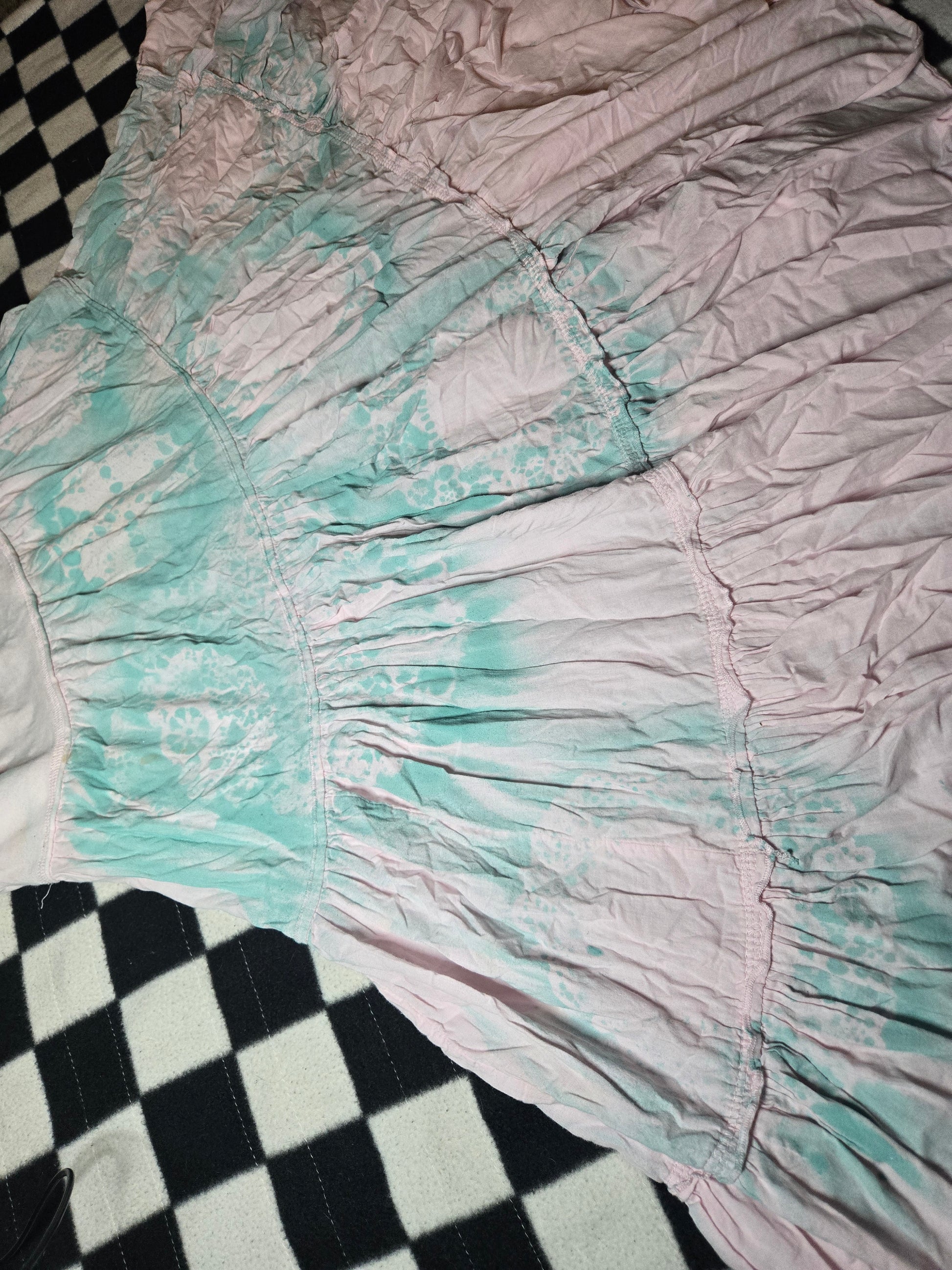 Long pastel pink size medium skirt with mint green/blue spray painted prints of doilies