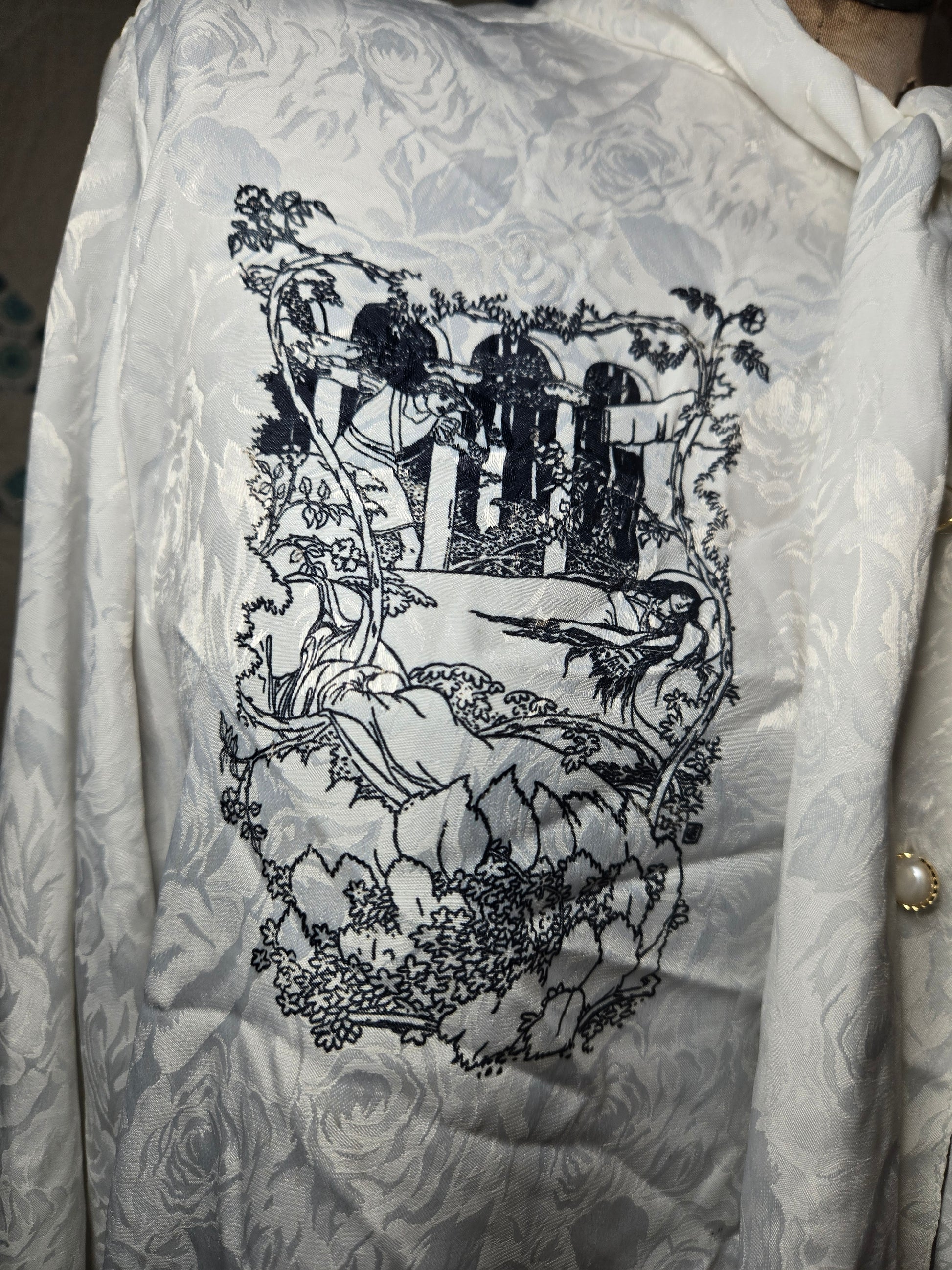Gorgeous white long sleeved button up blouse with roses and vintage print from a Sleeping Beauty book (size missing Medium or Large?)