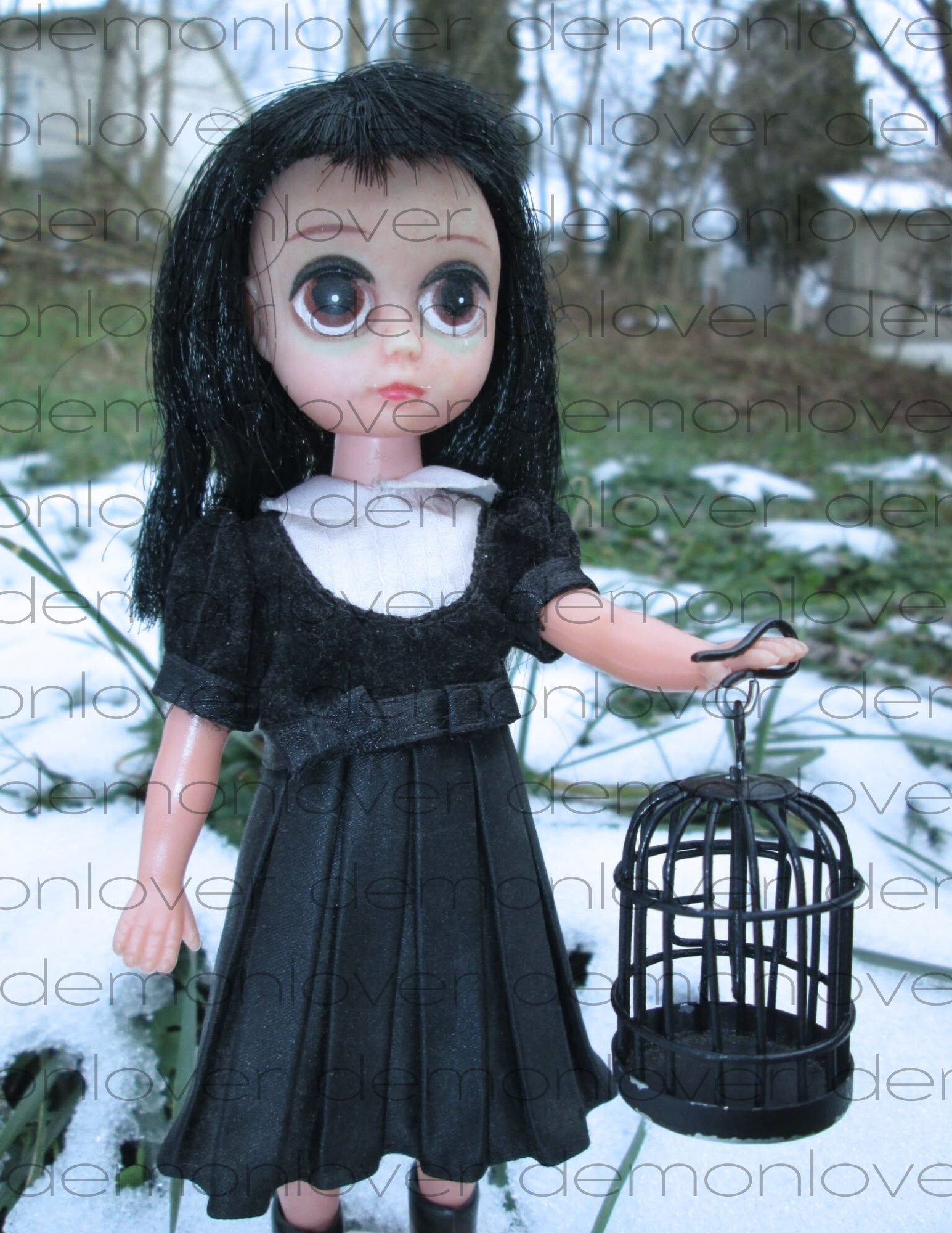 8.5/11 inch glossy print by me without watermark of my Susie Sad Eyes doll and a birdcage.